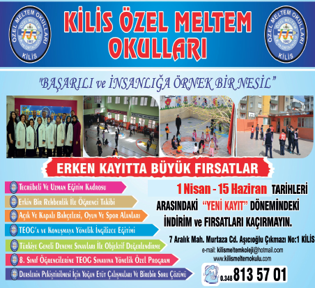 Okulumuzun; zengin kütüphanesi, teknolojik sınıfları, modern laboratuvarları, , iki adet spor salonu, yemekhanesi mevcuttur. İşte Özel Meltem Okulları; eğitim kadrosu, kapalı oyun salonu ve donanımlı derslikleriyle kilis önde gelen saygın eğitim kurumlarından biridir.